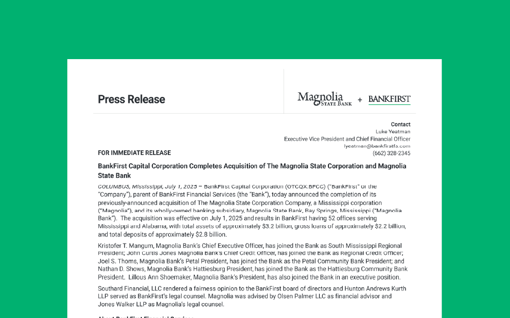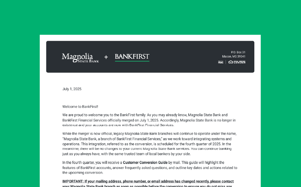 While the two banks have officially merged as of July 1, 2025, Magnolia State Bank and its branches will continue to operate independently, as usual, while both banks work toward integrating systems and operations into BankFirst through the conversion scheduled for November 14–17, 2025. Outside of the change in ownership, both banks will continue with business as usual, and your Magnolia State Bank team of local bankers will continue to be here to serve you during and after the transition.